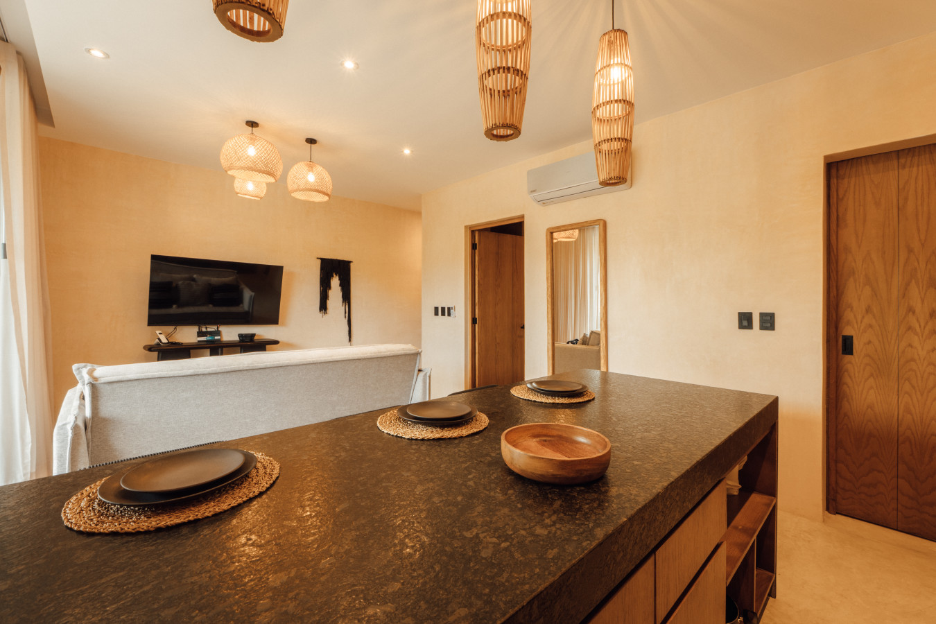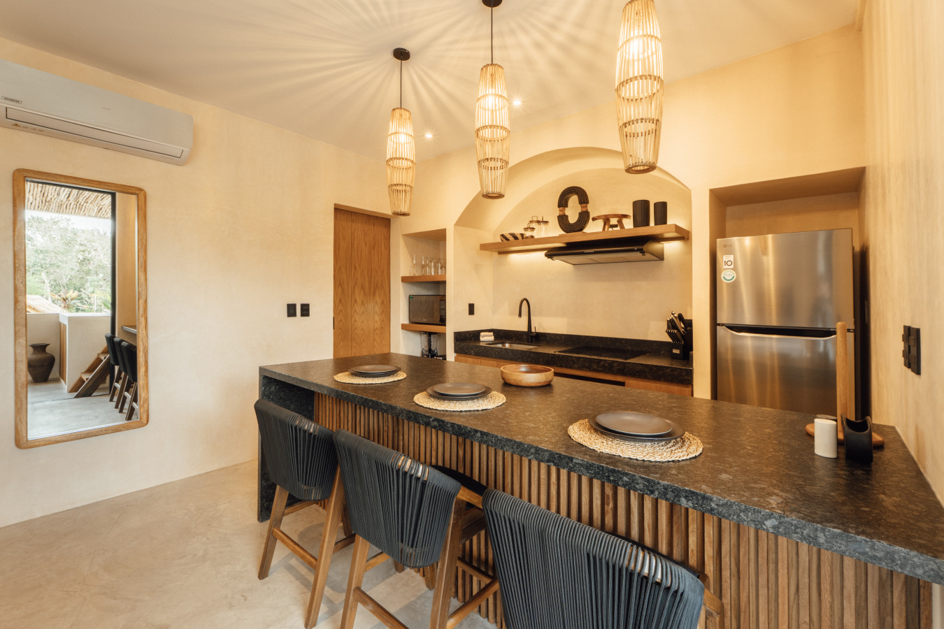 / nightExperience modern luxury at Onyx Escape This elegantly crafted unit features a private plunge pool, the perfect place to unwind while soaking in the views of Satori Tulum’s iconic pool and meticulously designed common areas. Inside, every detail is thoughtfully curated, from the fully equipped kitchen and premium appliances to the plush king-sized bed that ensures nights of absolute comfort, while the sofa bed offers additional sleeping for up to four guests. Complete with a washer and dryer. Experience the magic of Tulum at Satori, nestled in Region 15 just 6 minutes from the main avenue and 1 km into the jungle, providing the perfect blend of tranquility and easy access to the action. Only 3.5 km away, dive into the vibrant hotel zone, with its numerous beach clubs lining the stunning Caribbean coast. The route from Tulum Avenue offers convenient access to shops, restaurants, pharmacies, and a gas station. For a lively evening, the renowned Calle 7 in La Veleta, with its eclectic mix of restaurants, bars, and boutiques, is just a short trip away. Arriving at Your Tulum Escape: We want your arrival to be as seamless as possible. You’ll find convenient parking available directly in front of the condo. If you are arriving by taxi or private transfer, you can be dropped off right at the entrance, where our team will be waiting to warmly welcome you and show you around. Check-in: 3:00 PM to 5:00 PM. Our staff will be available to greet you and hand over the keys in person. After 6:00 PM: Check-in is done at the reception with the security guard. We will send all the instructions to access your accommodation. Housekeeping: Complimentary Housekeeping: Enjoy a free cleaning service every seven days of your stay. This includes tidying up the bathrooms and kitchen, making the beds, and cleaning the floors. Extra Cleaning: If you’d like a more thorough cleaning or more frequent service, just let your concierge know. (Additional fees apply and are subject to availability). Bedding & Towels: Linen Changes: For stays longer than seven days, fresh linens and towels will be provided during your complimentary cleaning. In-Unit Laundry: For your convenience, each unit has a washer and dryer. You can also request extra linen changes through your concierge for a small fee. Electricity: Power Supply Notes: Due to ongoing development in Tulum, occasional power outages may occur due to work by the CFE (Mexico's Federal Electricity Commission). These outages are sometimes announced in advance, but schedules can change. During the rainy and hurricane seasons, outages can be more frequent and last longer. What We Provide: We have flashlights and rechargeable fans available for your use. Electricity Usage: We’ll take a meter reading at check-in and check-out. Your reservation includes ___ kw/h per day. Usage beyond this will be charged at __ per kw/h. Internet Access: Wi-Fi Details: You’ll receive the Wi-Fi network name and password upon arrival. Tech Support: Please contact your concierge if you experience any issues with the internet. Possible Disruptions: Internet service may be affected during heavy rains and hurricanes. Water: Tap Water: The tap water is not suitable for drinking or cooking, but it’s perfectly safe for brushing your teeth and showering. Waste Disposal: Recycling & Trash: Each unit has separate bins for organic and inorganic waste. Trash Removal: Our housekeeping staff will empty the trash during your complimentary cleanings. There are also larger bins available for guests outside the building. Air Conditioning: Optimal AC Use: The ideal setting for the mini-split AC units in this area is 24°C (75°F). Maintenance Requests: Please report any issues with the AC immediately. Responsible Use: Please turn off the AC/heating when you leave the unit. Hot & Cold Water: Faucet Operation: In Mexico, turning the tap to the right is for cold water, and turning it to the left is for hot water. Hot Water Warm-Up: Please note that it may take a few minutes for the hot water to come through. Your Well-being is Our Priority: At Satori, we value communication with our guests and look forward to meeting you. We will be available at the property from 9:00 a.m. to 6:00 p.m. to provide you with the best service. For your convenience, you can also contact us via phone call or text message. In case of an emergency outside of these hours, please contact any member of our staff or the security guard, who will be ready to assist you. Relaxed among nature It is advisable to rent a car, or motorcycle for easy access to the beach and town. Bikes rented on site. Welcome to Satori Tulum, an exclusive sanctuary nestled in the heart of Tulum’s lush jungle. Here, luxury meets nature in perfect harmony, offering you an unparalleled getaway that blends refined architectural design, high-quality natural materials, and vibrant greenery. Immerse yourself in an Insta-worthy oasis featuring two spectacular main pools, thoughtfully curated spaces, and a serene ambiance designed to inspire relaxation and connection. While our location is a quick 7-minute drive from both Tulum’s vibrant town center and pristine beaches, the tranquil jungle setting ensures a peaceful retreat from the bustle. Please note that construction is ongoing nearby, with light noise possible between 9 am and 7 pm. However, the serenity of Satori Tulum and its wealth of amenities will undoubtedly make your stay memorable.