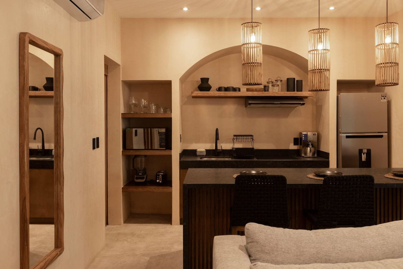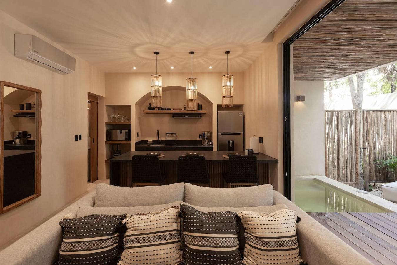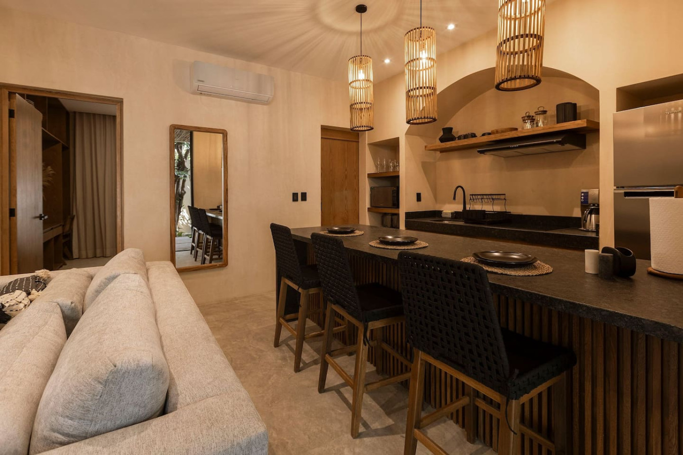 / nightEscape to a chic, ground-floor retreat with a private plunge pool and garden. Modern grays and blacks create a stylish ambiance. Work seamlessly with a dedicated desk, then unwind in the plush king bed. Fully equipped kitchen, washer/dryer, and sofa bed cater to all needs. Perfect for digital nomads, couples, or small families seeking a blend of comfort and adventure. Experience the magic of Tulum at Satori, nestled in Region 15 just 6 minutes from the main avenue and 1 km into the jungle, providing the perfect blend of tranquility and easy access to the action. Only 3.5 km away, dive into the vibrant hotel zone, with its numerous beach clubs lining the stunning Caribbean coast. The route from Tulum Avenue offers convenient access to shops, restaurants, pharmacies, and a gas station. For a lively evening, the renowned Calle 7 in La Veleta, with its eclectic mix of restaurants, bars, and boutiques, is just a short trip away. Arriving at Your Tulum Escape: We want your arrival to be as seamless as possible. You’ll find convenient parking available directly in front of the condo. We recommend you download the directions and the internet password for the common areas so you can access the access code for your accommodation Check-in: 4:00 PM Check-out: 11:00 AM Housekeeping: Complimentary Housekeeping: Enjoy a free cleaning service every seven days of your stay. This includes tidying up the bathrooms and kitchen, making the beds, and cleaning the floors. Extra Cleaning: If you’d like a more thorough cleaning or more frequent service, just let your concierge know. (Additional fees apply and are subject to availability). Bedding & Towels: Linen Changes: For stays longer than seven days, fresh linens and towels will be provided during your complimentary cleaning. In-Unit Laundry: For your convenience, each unit has a washer and dryer. You can also request extra linen changes through your concierge for a small fee. Electricity: Power Supply Notes: Due to ongoing development in Tulum, occasional power outages may occur due to work by the CFE (Mexico's Federal Electricity Commission). These outages are sometimes announced in advance, but schedules can change. During the rainy and hurricane seasons, outages can be more frequent and last longer. What We Provide: We have flashlights and rechargeable fans available for your use. Electricity Usage: We’ll take a meter reading at check-in and check-out. Your reservation includes ___ kw/h per day. Usage beyond this will be charged at __ per kw/h. Internet Access: Wi-Fi Details: You’ll receive the Wi-Fi network name and password upon arrival. Tech Support: Please contact your concierge if you experience any issues with the internet. Possible Disruptions: Internet service may be affected during heavy rains and hurricanes. Water: Tap Water: The tap water is not suitable for drinking or cooking, but it’s perfectly safe for brushing your teeth and showering. Waste Disposal: Recycling & Trash: Each unit has separate bins for organic and inorganic waste. Trash Removal: Our housekeeping staff will empty the trash during your complimentary cleanings. There are also larger bins available for guests outside the building. Air Conditioning: Optimal AC Use: The ideal setting for the mini-split AC units in this area is 24°C (75°F). Maintenance Requests: Please report any issues with the AC immediately. Responsible Use: Please turn off the AC/heating when you leave the unit. Hot & Cold Water: Faucet Operation: In Mexico, turning the tap to the right is for cold water, and turning it to the left is for hot water. Hot Water Warm-Up: Please note that it may take a few minutes for the hot water to come through. Your Well-being is Our Priority: At Satori, we value communication with our guests and look forward to meeting you. We will be available at the property from 9:00 a.m. to 6:00 p.m. to provide you with the best service. In case of an emergency outside of these hours, please contact any member of our staff or the security guard, who will be ready to assist you. Relaxed among nature It is advisable to rent a car, or motorcycle for easy access to the beach and town. Bikes rented on site. Welcome to Satori Tulum, an exclusive sanctuary nestled in the heart of Tulum’s lush jungle. Here, luxury meets nature in perfect harmony, offering you an unparalleled getaway that blends refined architectural design, high-quality natural materials, and vibrant greenery. Immerse yourself in an oasis featuring two spectacular main pools, thoughtfully curated spaces, and a serene ambiance designed to inspire relaxation and connection. While our location is a quick 7-minute drive from both Tulum’s vibrant town center and pristine beaches, the tranquil jungle setting ensures a peaceful retreat from the bustle. Please note that construction is ongoing nearby, with light noise possible between 9 am and 7 pm. However, the serenity of Satori Tulum and its wealth of amenities will undoubtedly make your stay memorable.